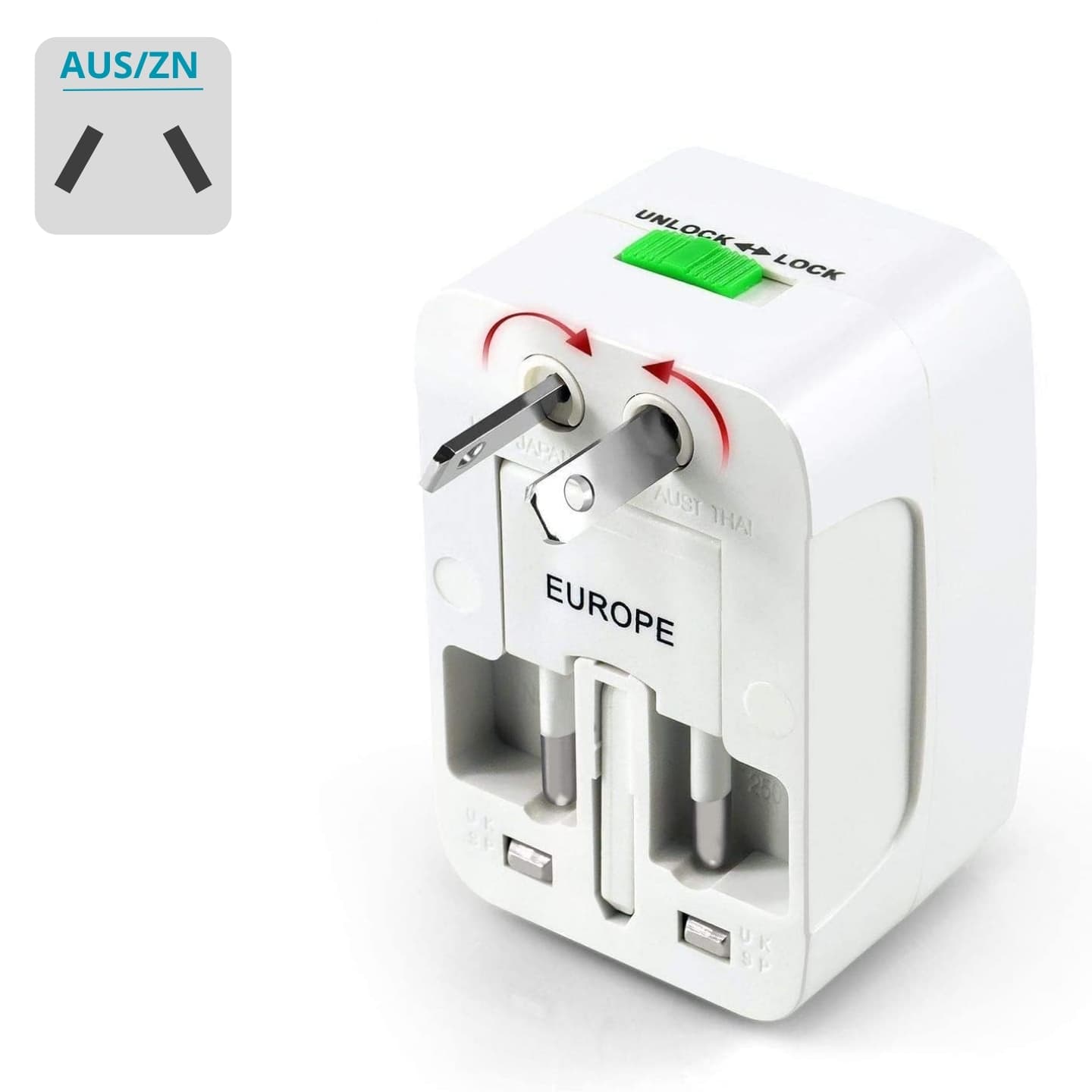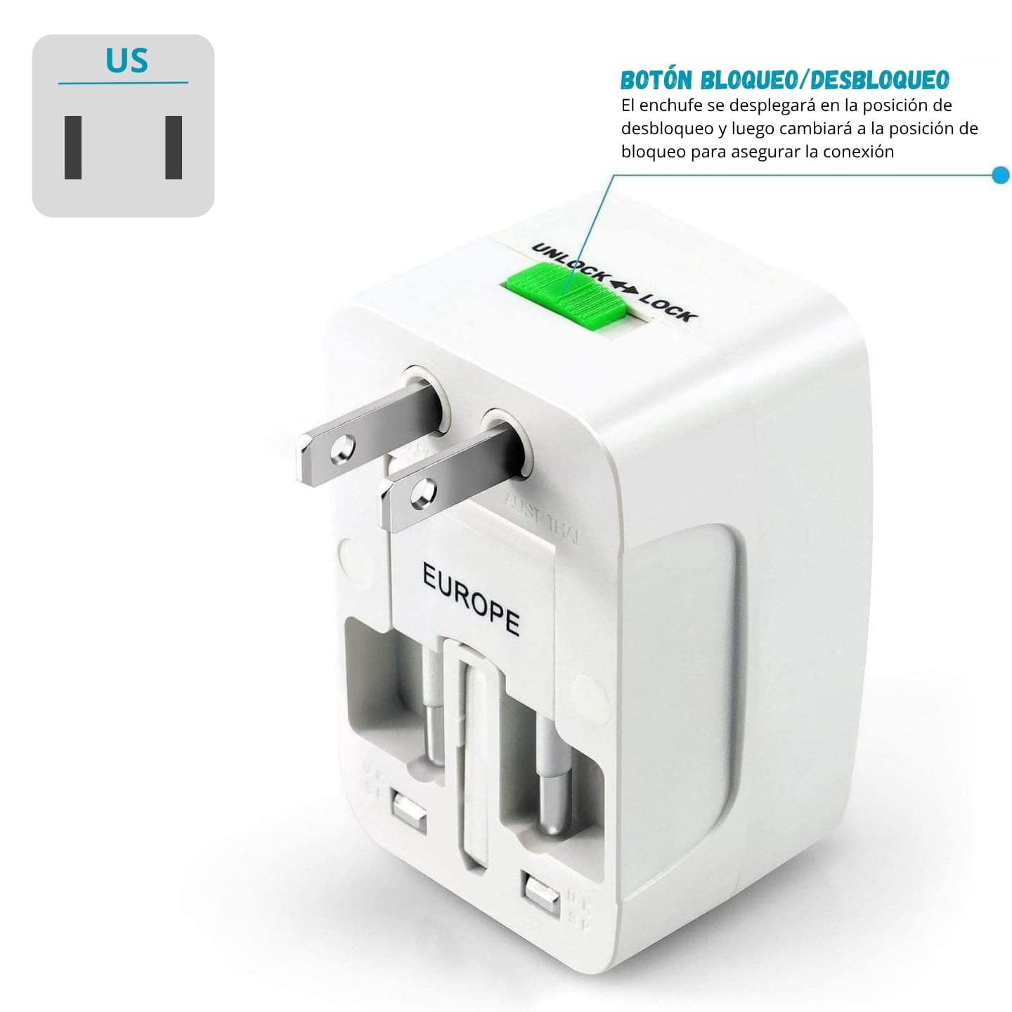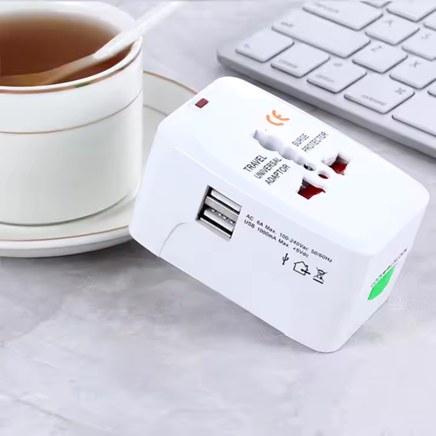 Adaptador multi región para enchufar cargadores y equipos de bajo consumo cuando cambia el tipo de toma: una sola pieza en la valija frente a adaptadores sueltos por país. - Las salidas USB permiten cargar teléfonos o accesorios sin sumar otro cargador de pared si ya tenés el cable a mano. - El obturador de seguridad y el indicador de encendido dan feedback visual al energizar el bloque. - Pensado para hoteles, aeropuertos y estancias donde el enchufe local no coincide con tus cables habituales.
