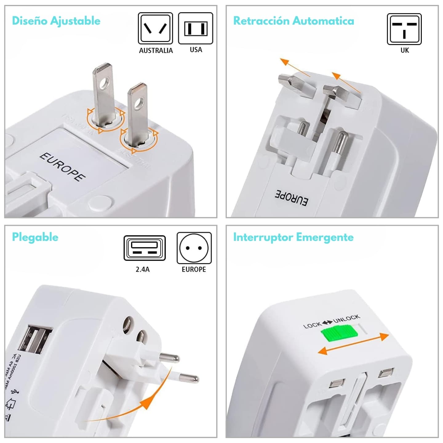 Adaptador Universal Viajeros Travel Adapter Mundial Viajes + 2 USB
