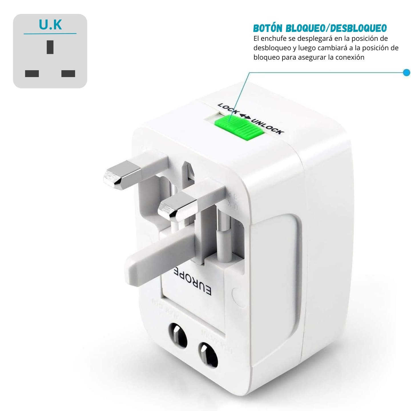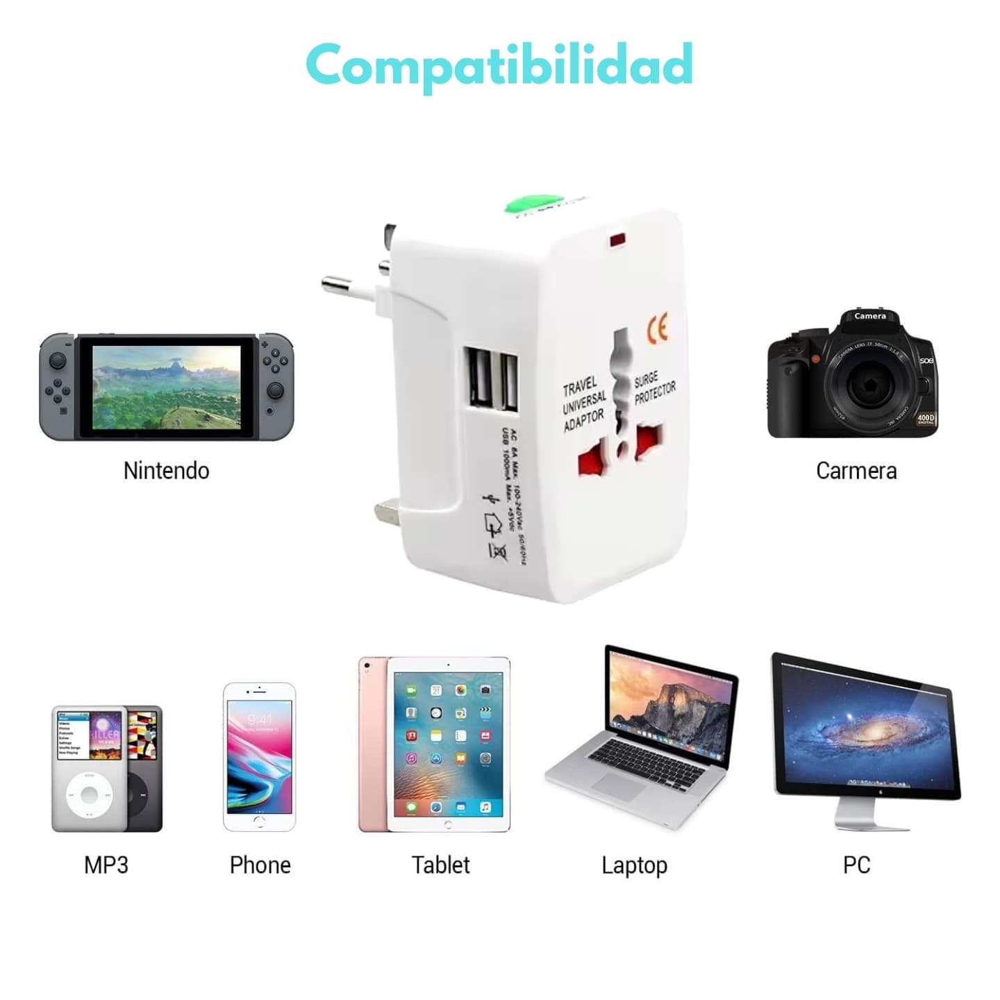 Adaptador universal para más de 150 países, protección de picos y salida universal.