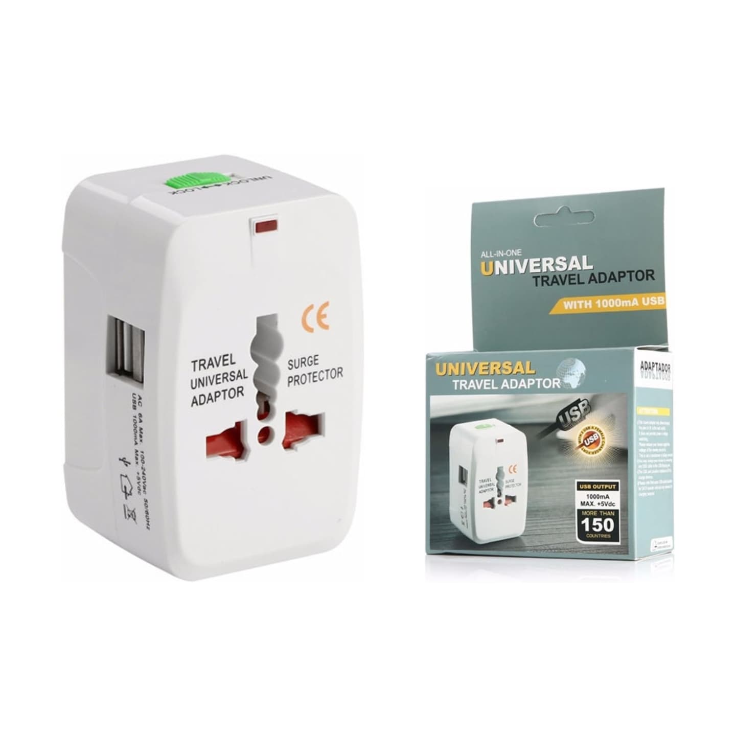 Adaptador de viaje con 2 salidas USB (1000 mA, 5 V), compatible con más de 150 países y protección de picos.