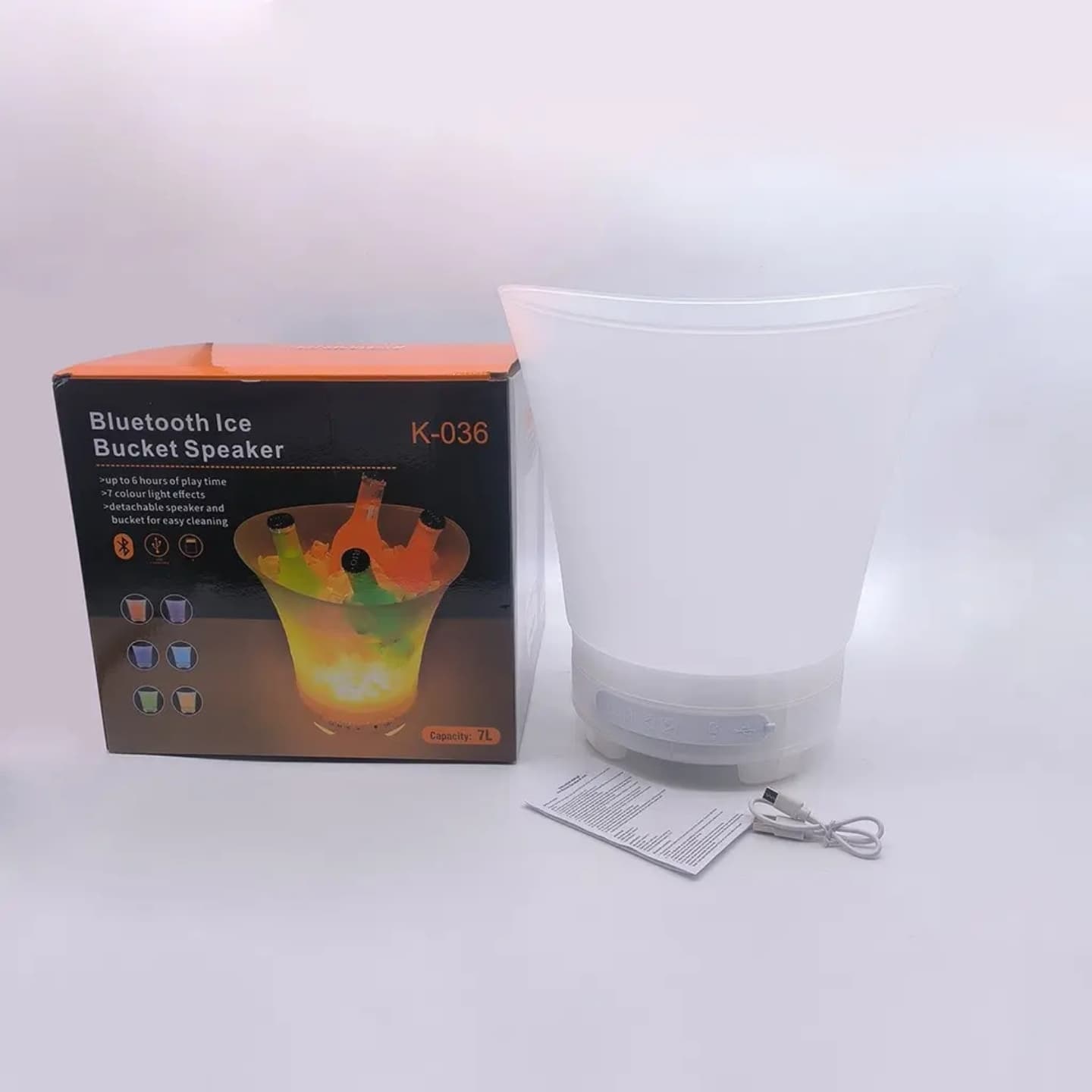 Frapera 7 L con parlante Bluetooth 5.1, LED RGB, batería integrada y cuerpo blanco transparente (PP food grade).