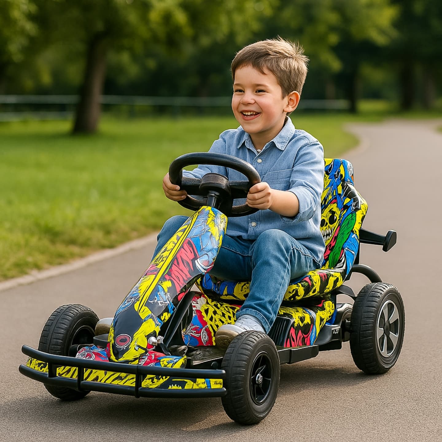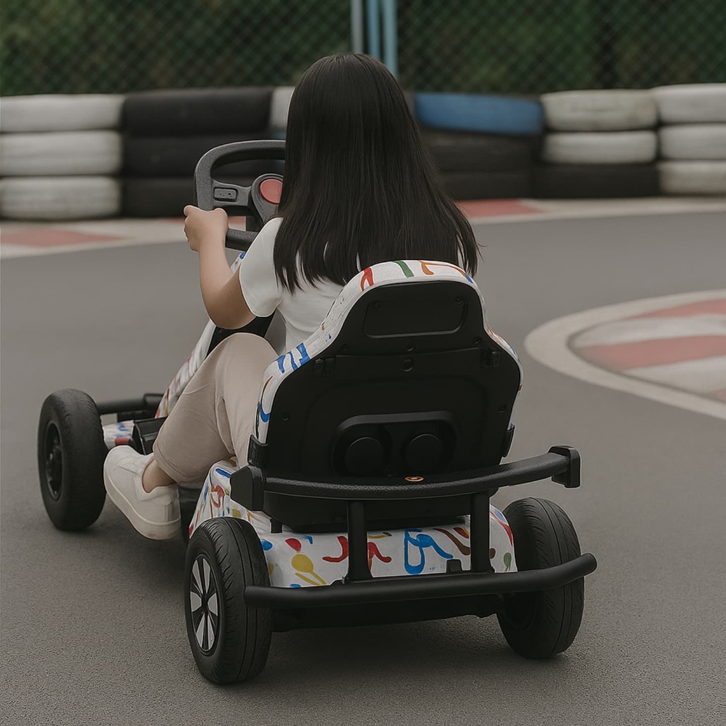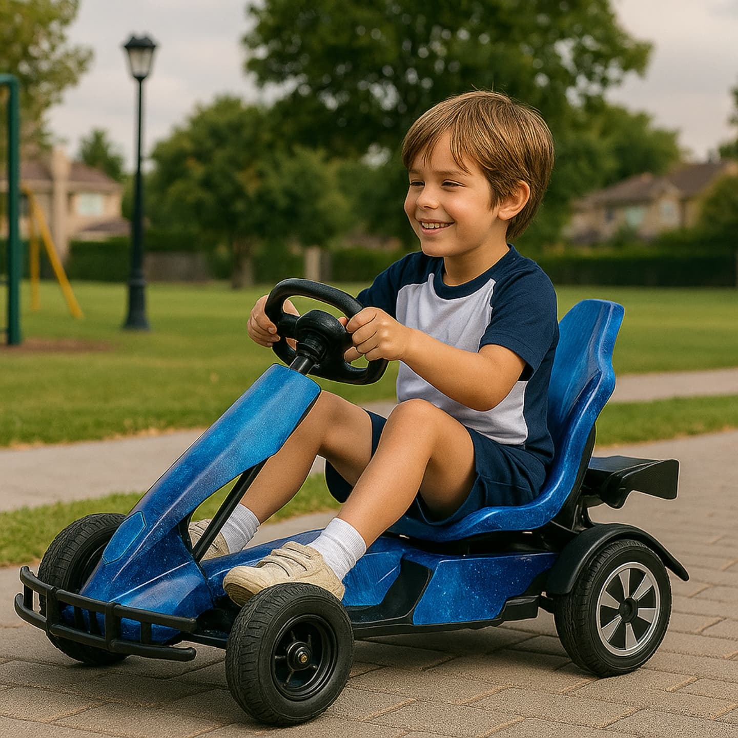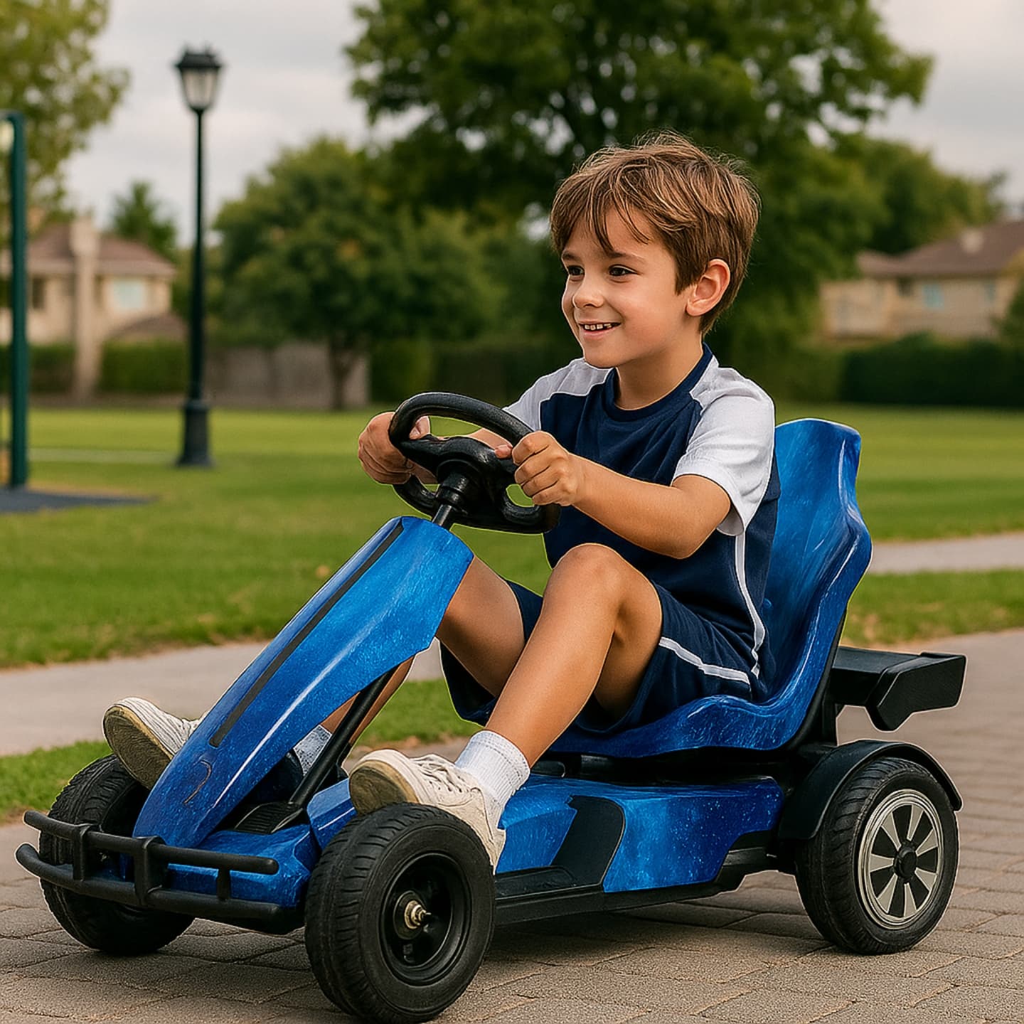 Karting eléctrico con luces LED, audio por Bluetooth y propulsión a batería para uso recreativo en espacios amplios y supervisión adulta. - Frenado combinado por desaceleración del motor y freno mecánico trasero según terreno y pendiente. - Ruedas de mayor diámetro y chasis dimensionado para el rango de edad indicado; respetar siempre peso máximo. - Ensamblaje con piezas incluidas: volante, parachoques, alerón, antena con bandera y kit según caja. Cuidado de batería: no exceder tiempos de carga indicados; mantener conectores secos y seguir el manual del fabricante.