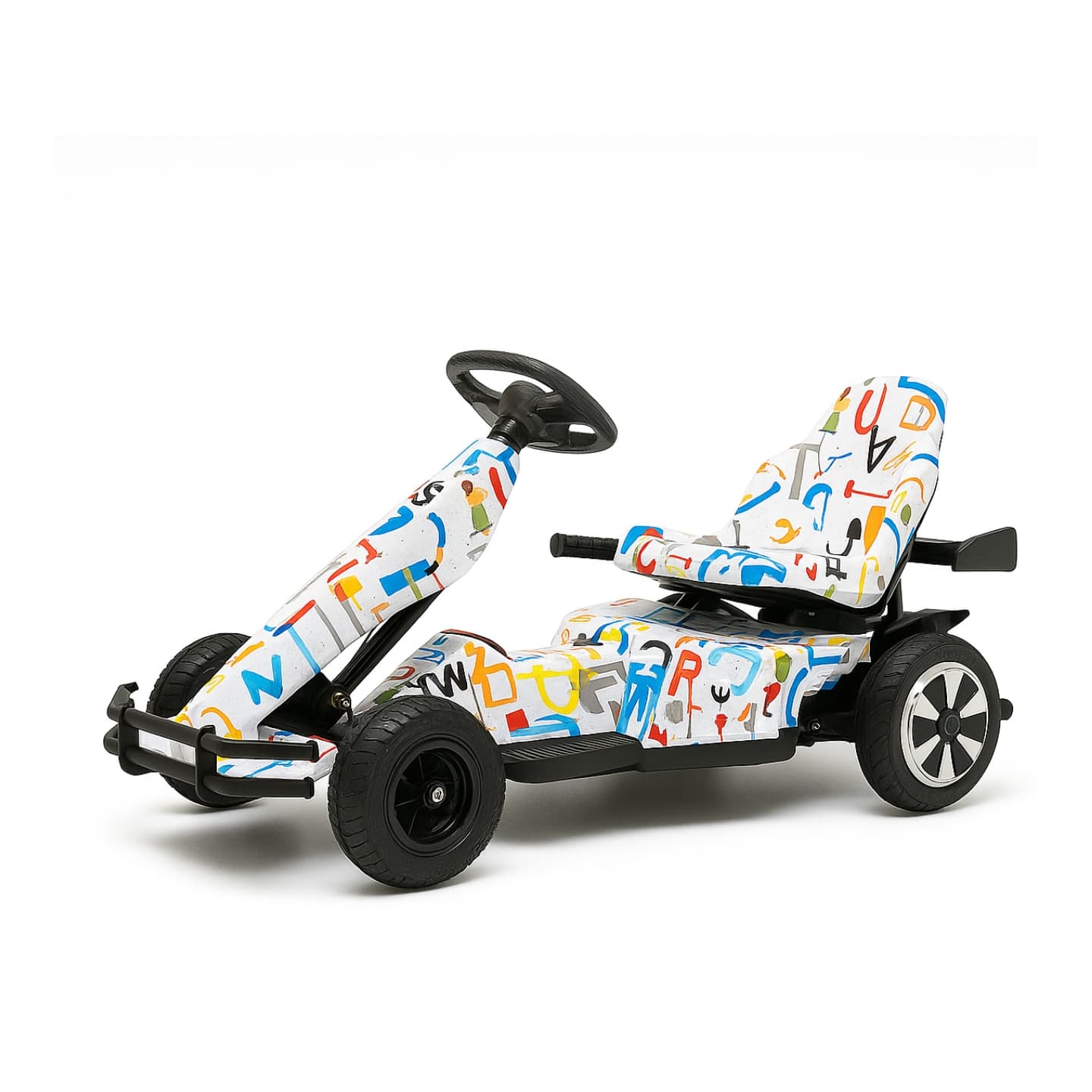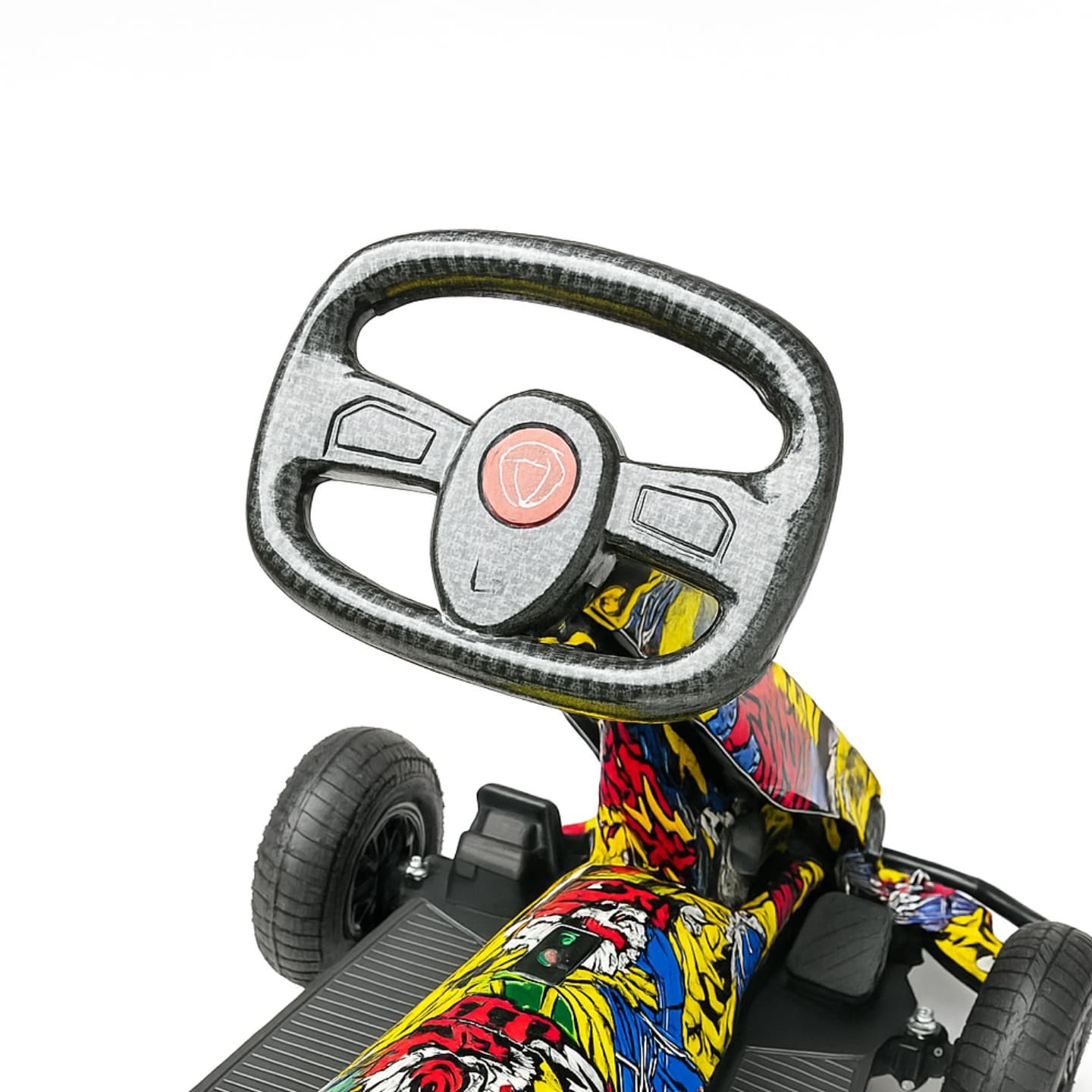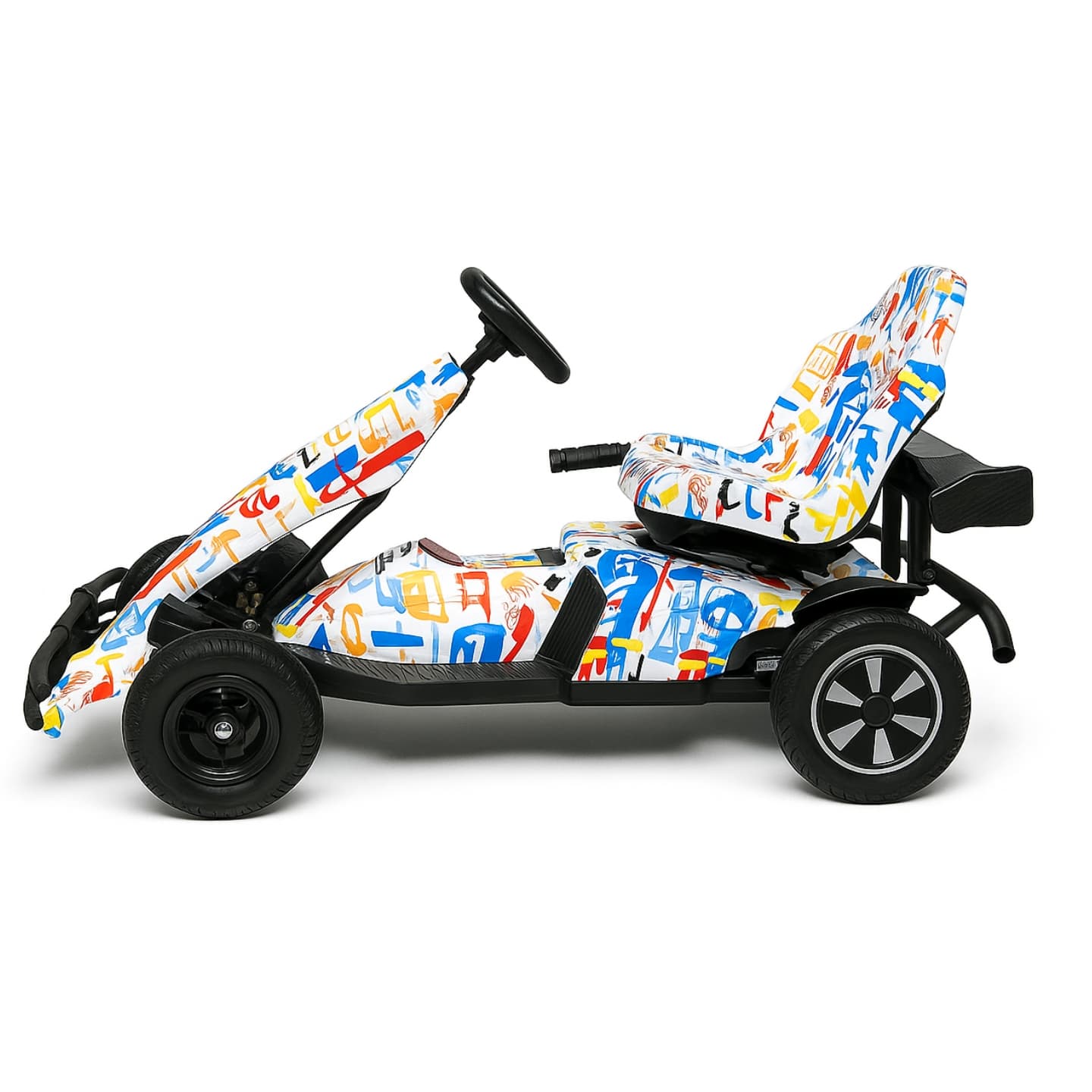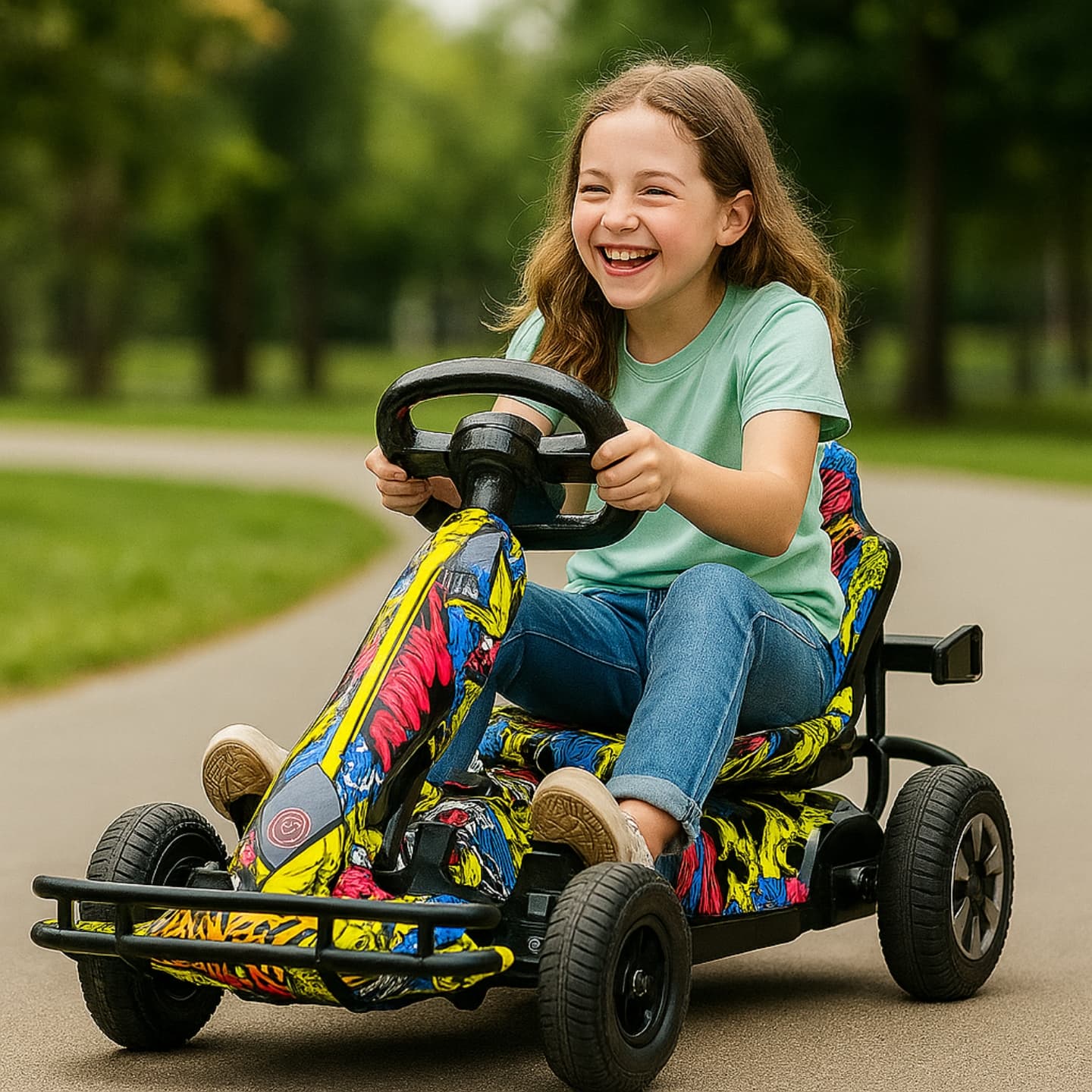 Karting eléctrico con luces LED, audio por Bluetooth y propulsión a batería para uso recreativo en espacios amplios y supervisión adulta. - Frenado combinado por desaceleración del motor y freno mecánico trasero según terreno y pendiente. - Ruedas de mayor diámetro y chasis dimensionado para el rango de edad indicado; respetar siempre peso máximo. - Ensamblaje con piezas incluidas: volante, parachoques, alerón, antena con bandera y kit según caja. Cuidado de batería: no exceder tiempos de carga indicados; mantener conectores secos y seguir el manual del fabricante.
