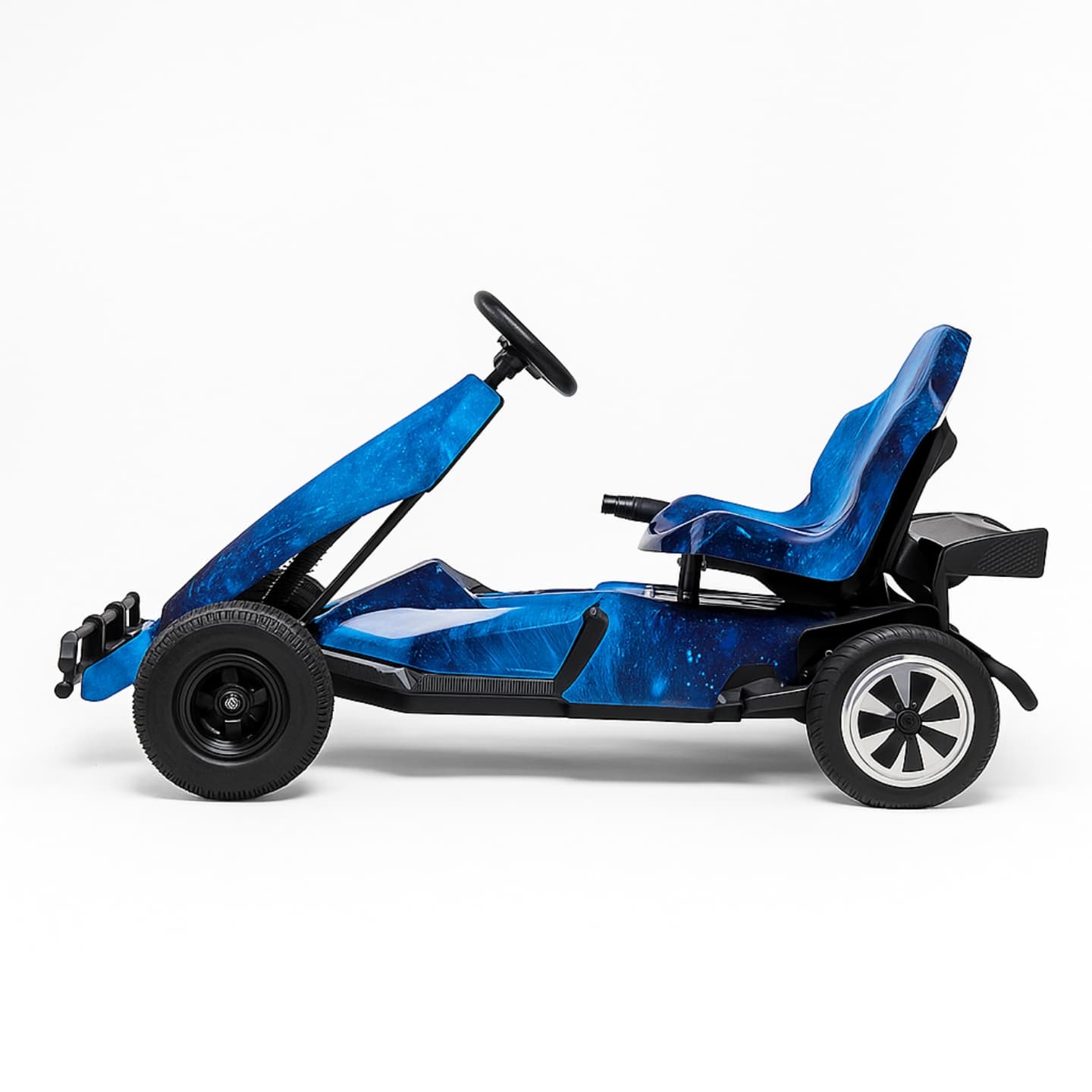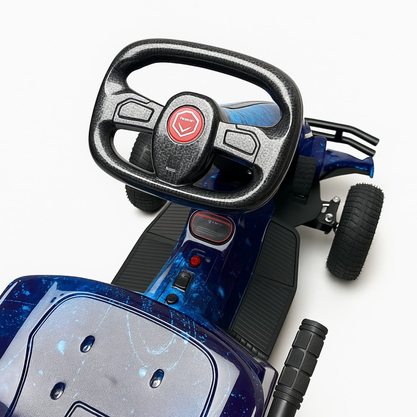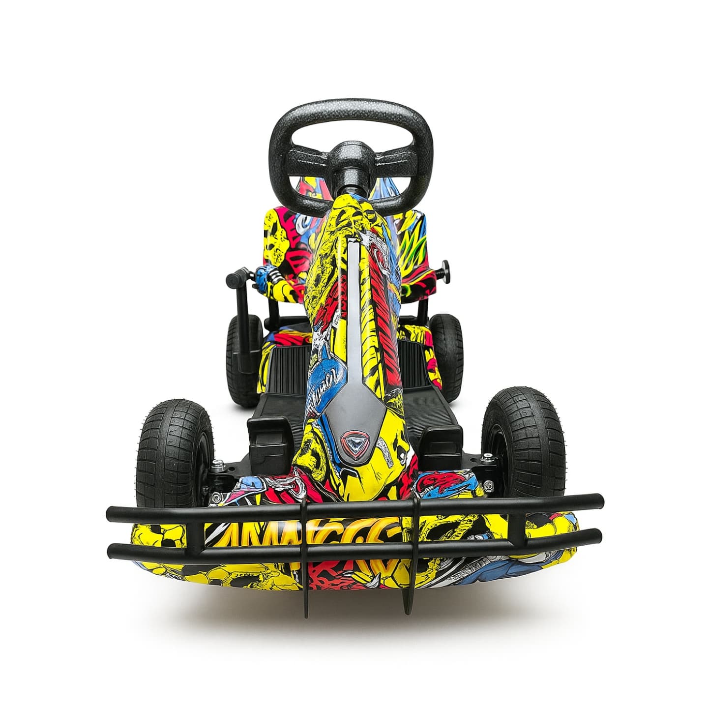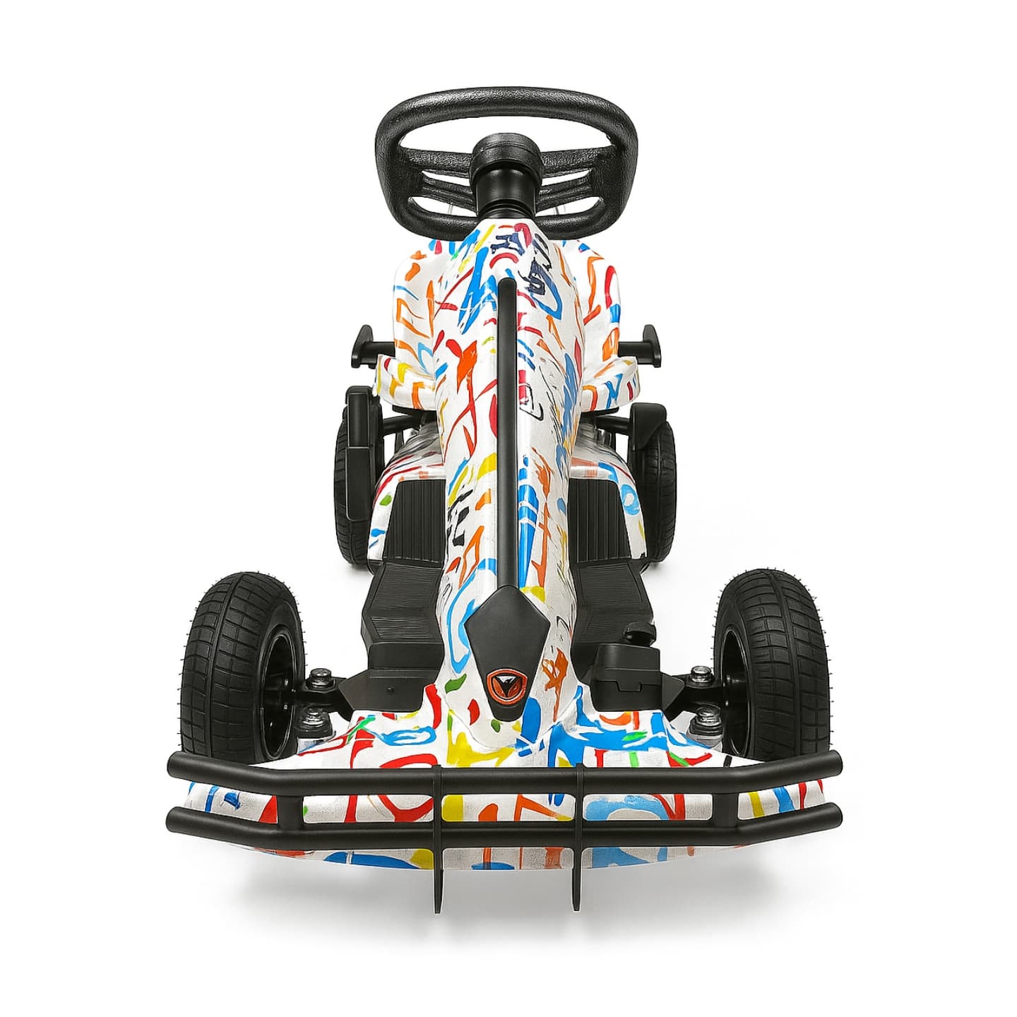 Karting eléctrico con luces LED, audio por Bluetooth y propulsión a batería para uso recreativo en espacios amplios y supervisión adulta. - Frenado combinado por desaceleración del motor y freno mecánico trasero según terreno y pendiente. - Ruedas de mayor diámetro y chasis dimensionado para el rango de edad indicado; respetar siempre peso máximo. - Ensamblaje con piezas incluidas: volante, parachoques, alerón, antena con bandera y kit según caja. Cuidado de batería: no exceder tiempos de carga indicados; mantener conectores secos y seguir el manual del fabricante.
