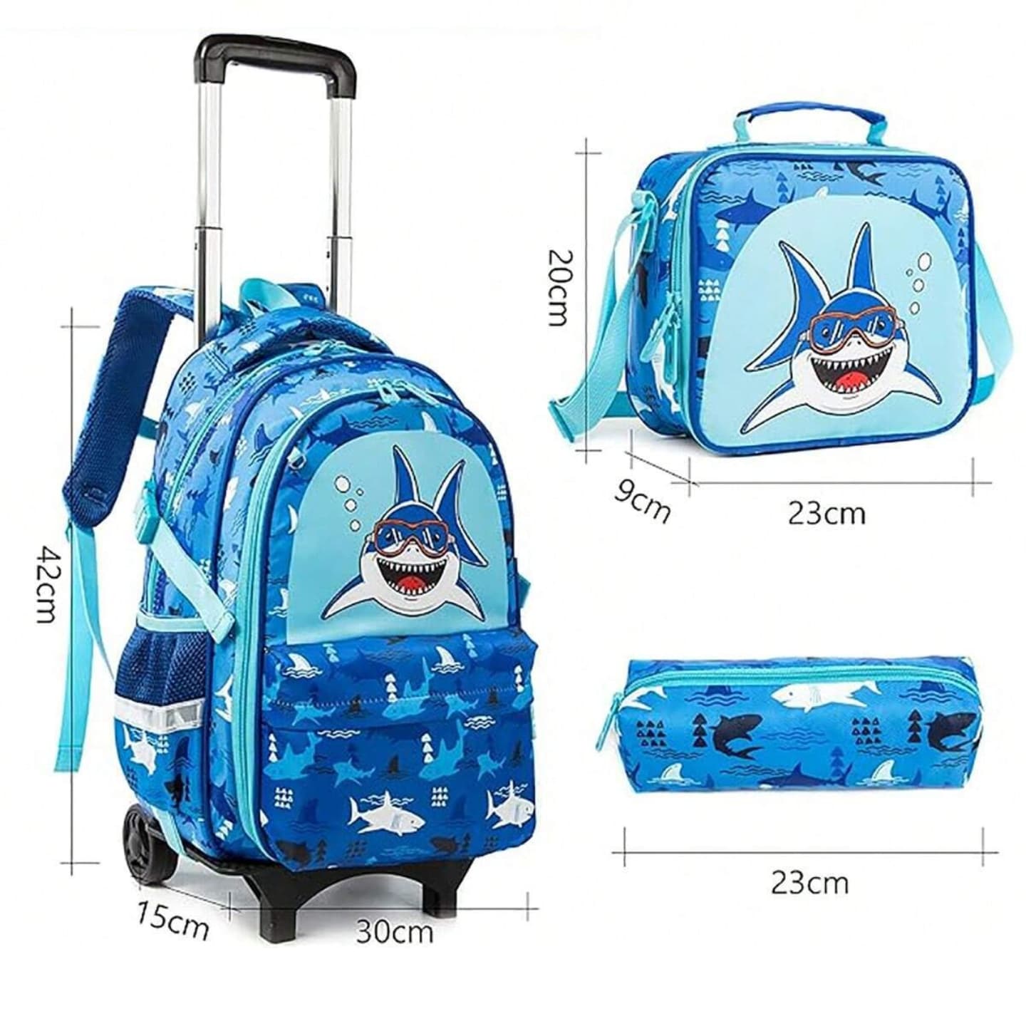 Kit 3 en 1 Jasminestar: mochila con carro, vianda y cartuchera tiburón azul marino.
