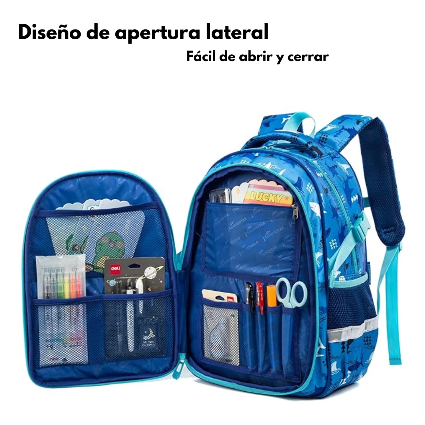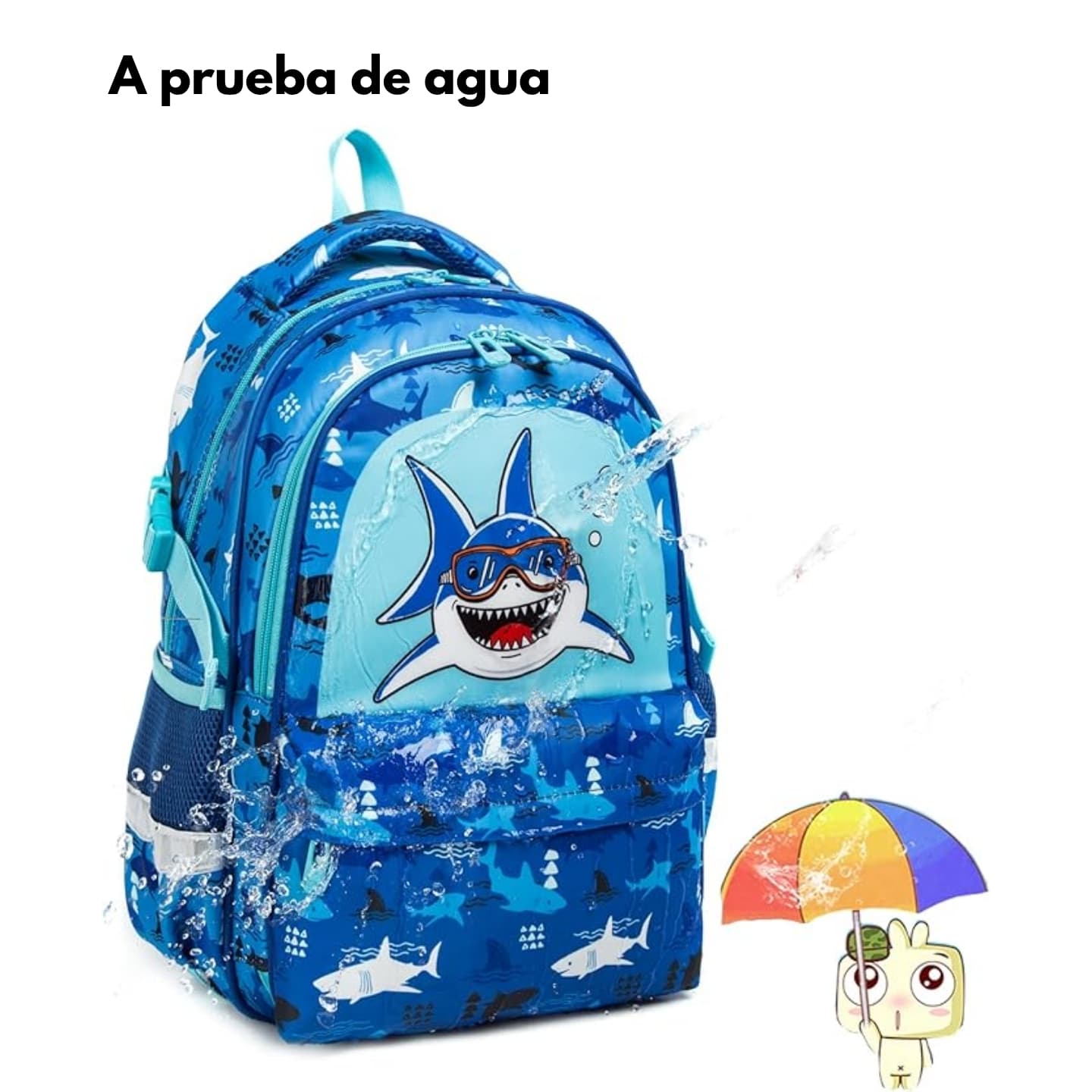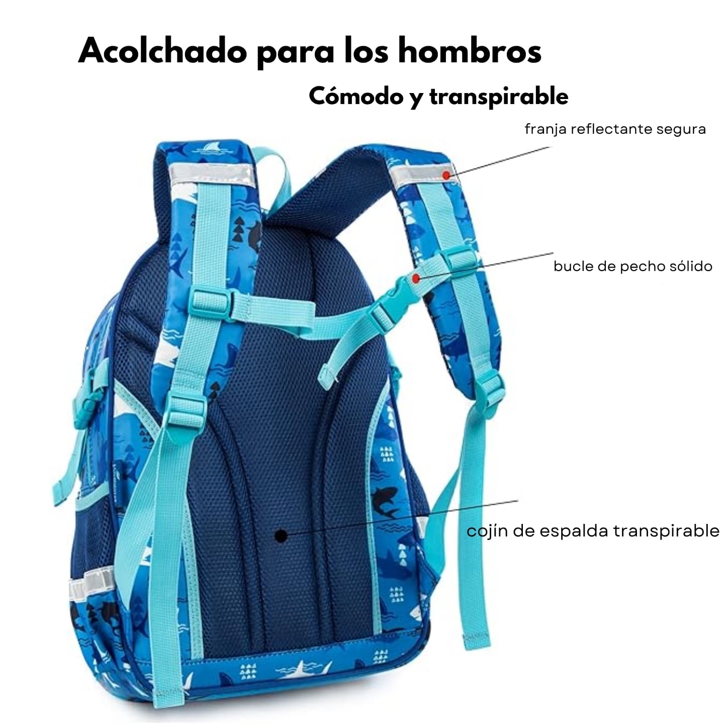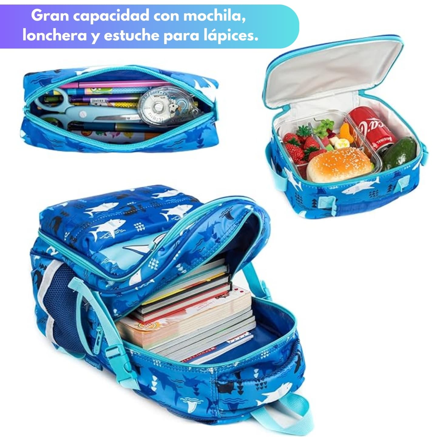 Kit escolar coordinado: mochila con carro, vianda y cartuchera con estampado de tiburón en tono azul marino. - Carro desmontable para aliviar el peso en trayectos largos y volver a modo mochila clásica cuando hace falta. - Estructura pensada para el uso diario: cierres resistentes y mango acolchado para tirar el carro. - Vianda y cartuchera completan el conjunto para unificar material de estudio y merienda con el mismo diseño.