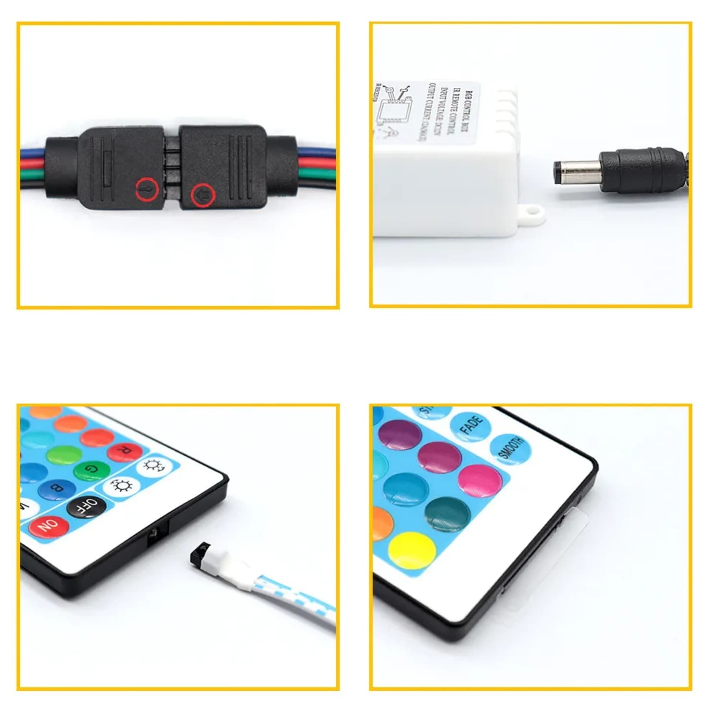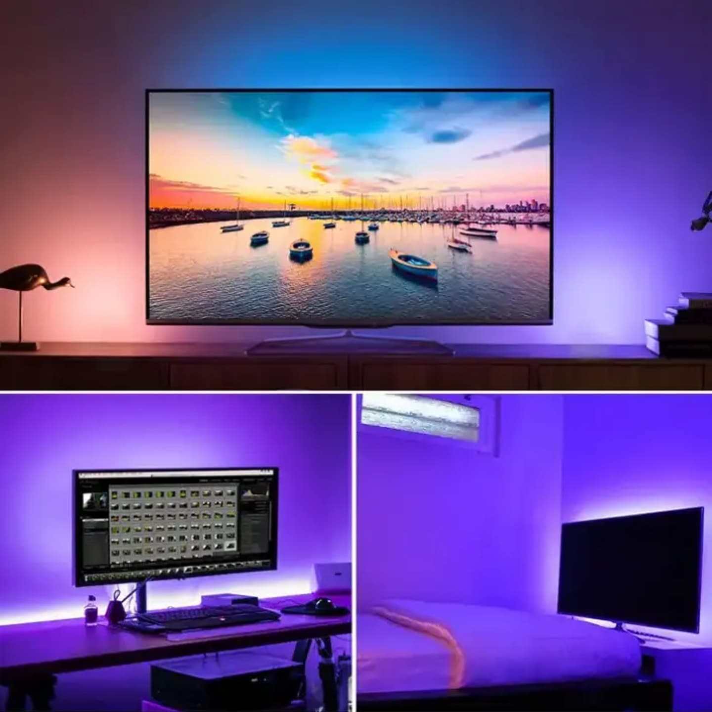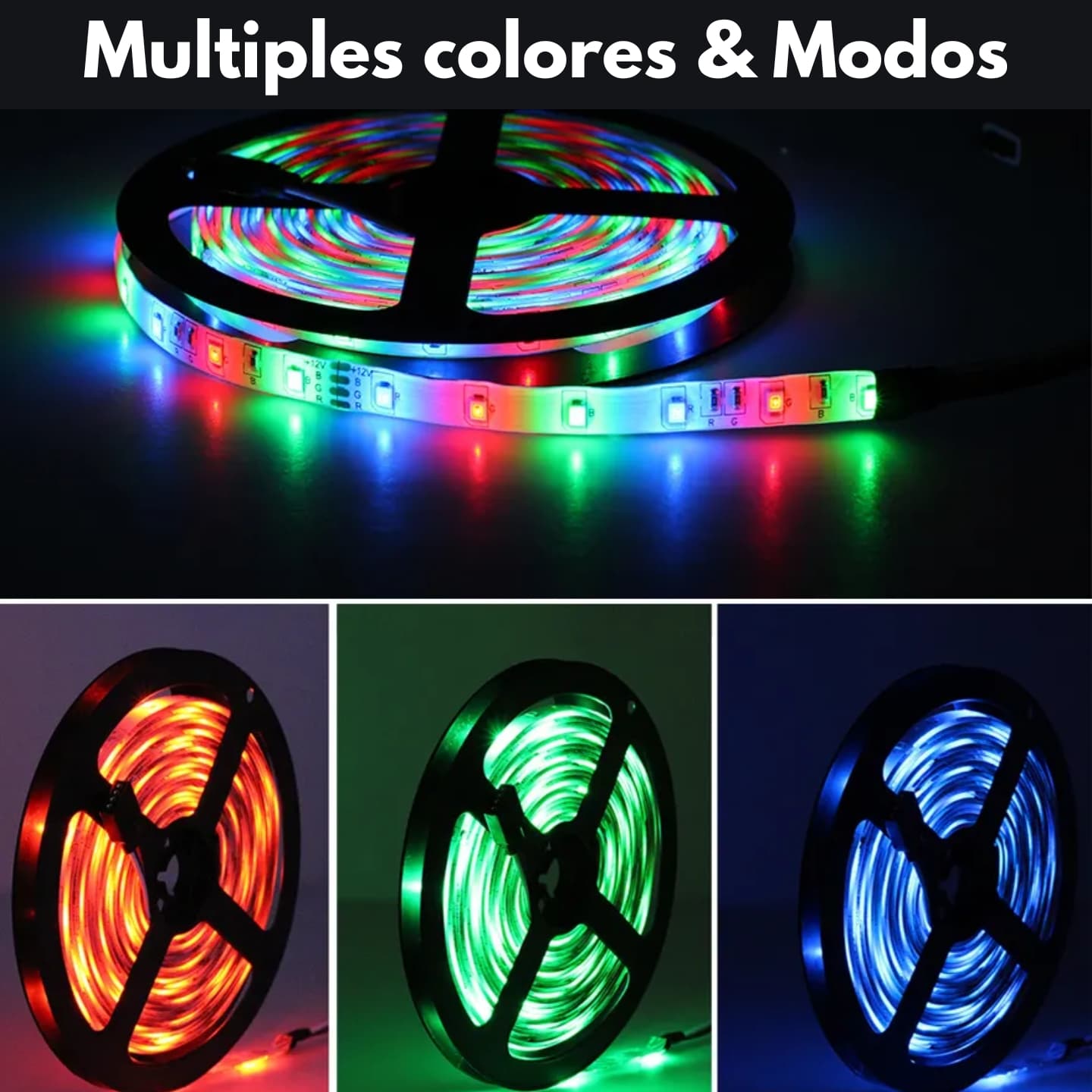 Tira LED RGB para marcar molduras, respaldos o vitrinas con color uniforme y control desde el mando incluido. - El kit con fuente y controlador evita compatibilizar componentes por separado en una instalación básica. - Secciones cortables para ajustar la longitud a muebles, estanterías o setup de PC. - Uso habitual: ambientación en el living, gaming o escenarios de foto y video con luz de acento cromática.